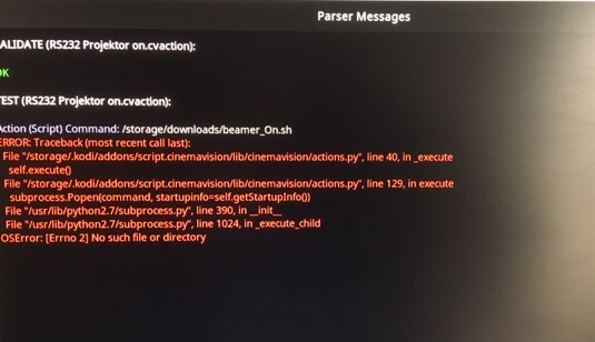 In Cinemavision I can run a bash skript, but need to write the correct path. The "example.cvaction" can run the bash script.