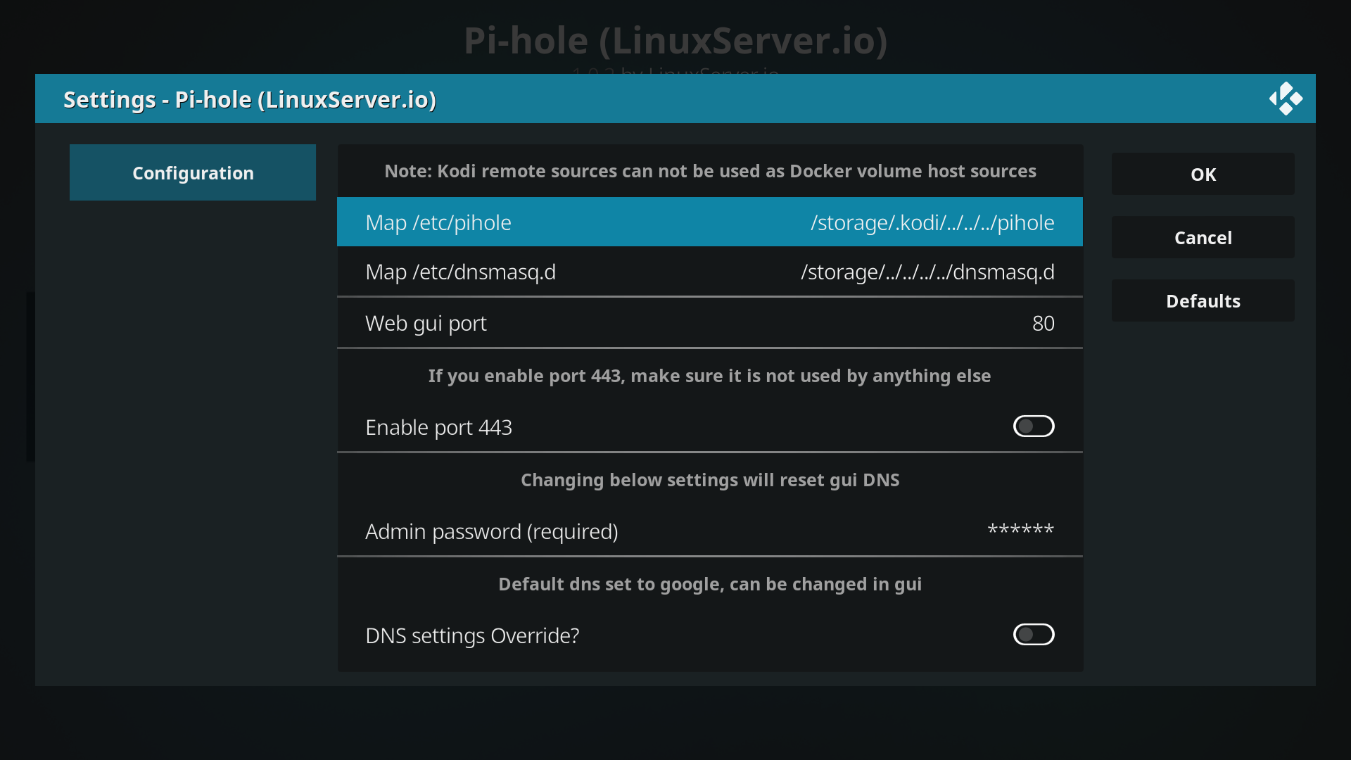 Display Moredocker run -d \ --name pihole \ --network host \ --cap-add NET_ADMIN \ -v "/storage/.kodi/userdata/addon_data/pihole/pihole/:/etc/pihole/" \ -v "/storage/.kodi/userdata/addon_data/pihole/dnsmasq.d/:/etc/dnsmasq.d/" \ -e ServerIP="192.168.1.xx" \ -e WEBPASSWORD="yourpasswordhere" \ -e TZ="Asia/Karachi" \ -e IPv6="False" \ diginc/pi-hole-multiarch:debian_armhfSet your server IP, webpassword and timezone, then just paste the command and hit enter. Your pihole will be up and running, with a working DHCP component if you want to use that too.