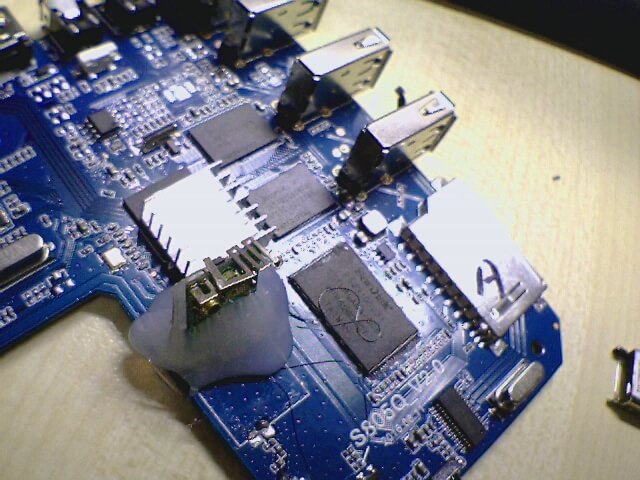 Its interesting to note that these pins are connected to a IC MA8601, which is a USB 2.0 High Speed 4-port hub controller. So keeping that in mind, I needed to make sure that the other usb ports are still working after the mod.