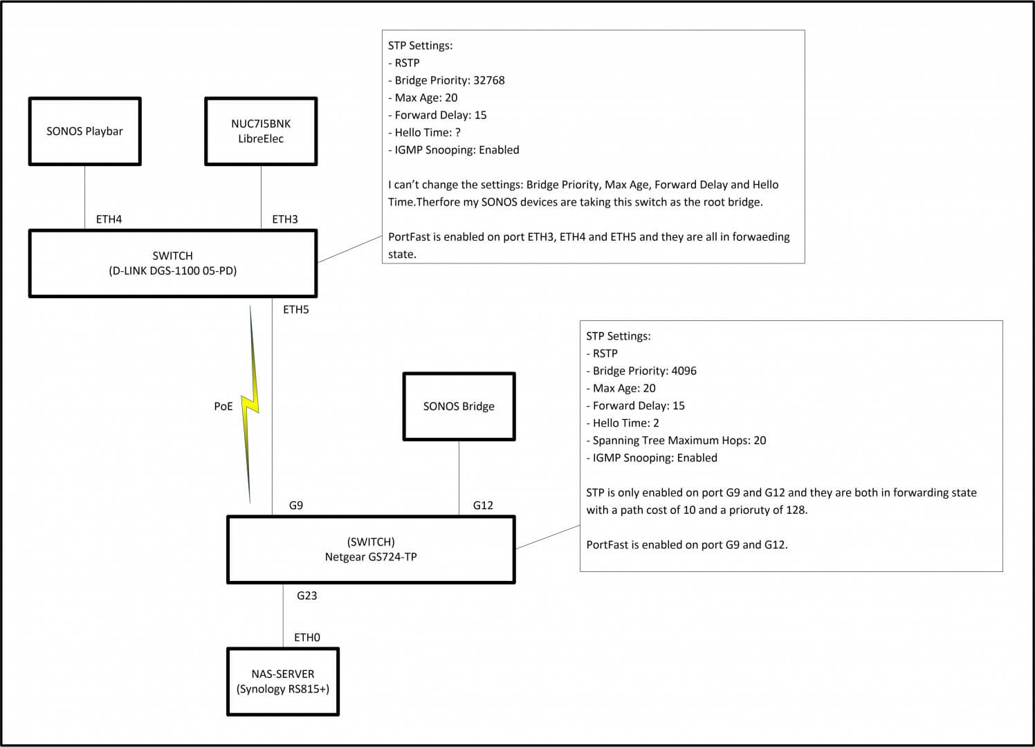 I am experiencing some strange behavior of LibreElec on a NUC7I5BNK. I have several Sonos devices in my home. Two of these devices are connected to the LAN to force Sonos to use its mesh wireless network rather than the home WiFi. All other Sonos devices connect through this Sonos wireless mesh network. The Sonos devices make use of STP because one device can be connected with wireless and LAN at the same time. Below you'll find a picture which explains the connections concerned.