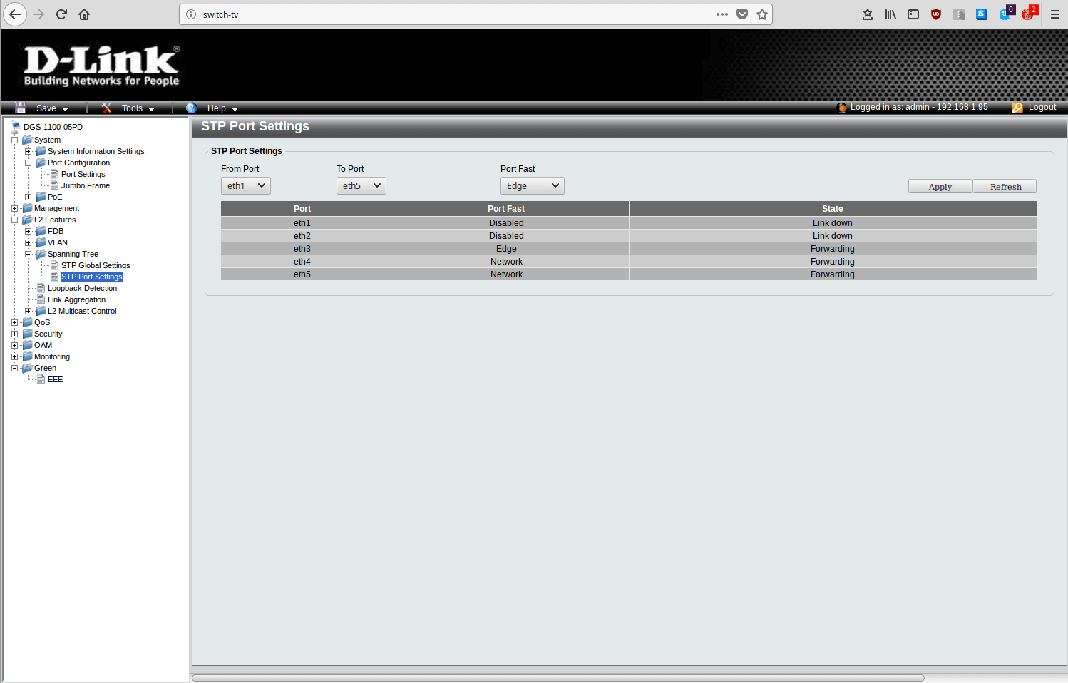 My LibreElec database/library is on a MySQL server on my nas-server as well as my media files. Now here is the strange thing: when I enable STP on the DGS-1100-05-PD switch, LibreElec says "Your library is currently empty". When I disable STP on the DGS-1100-05-PD LibreElec shows my library as it should.