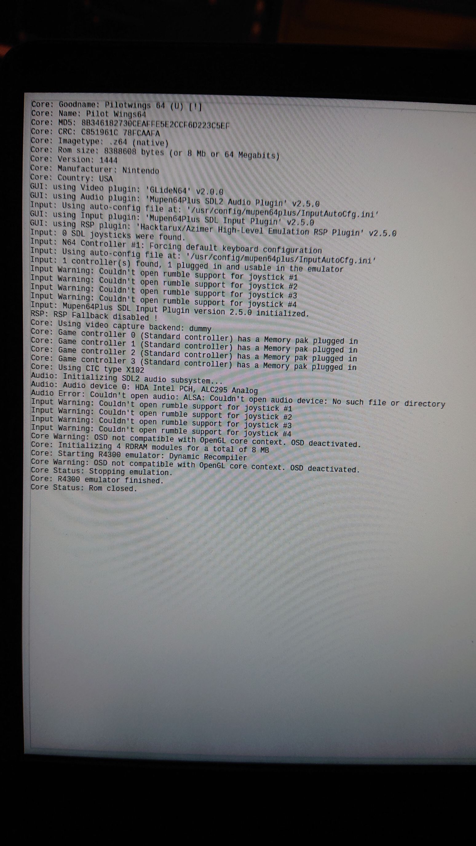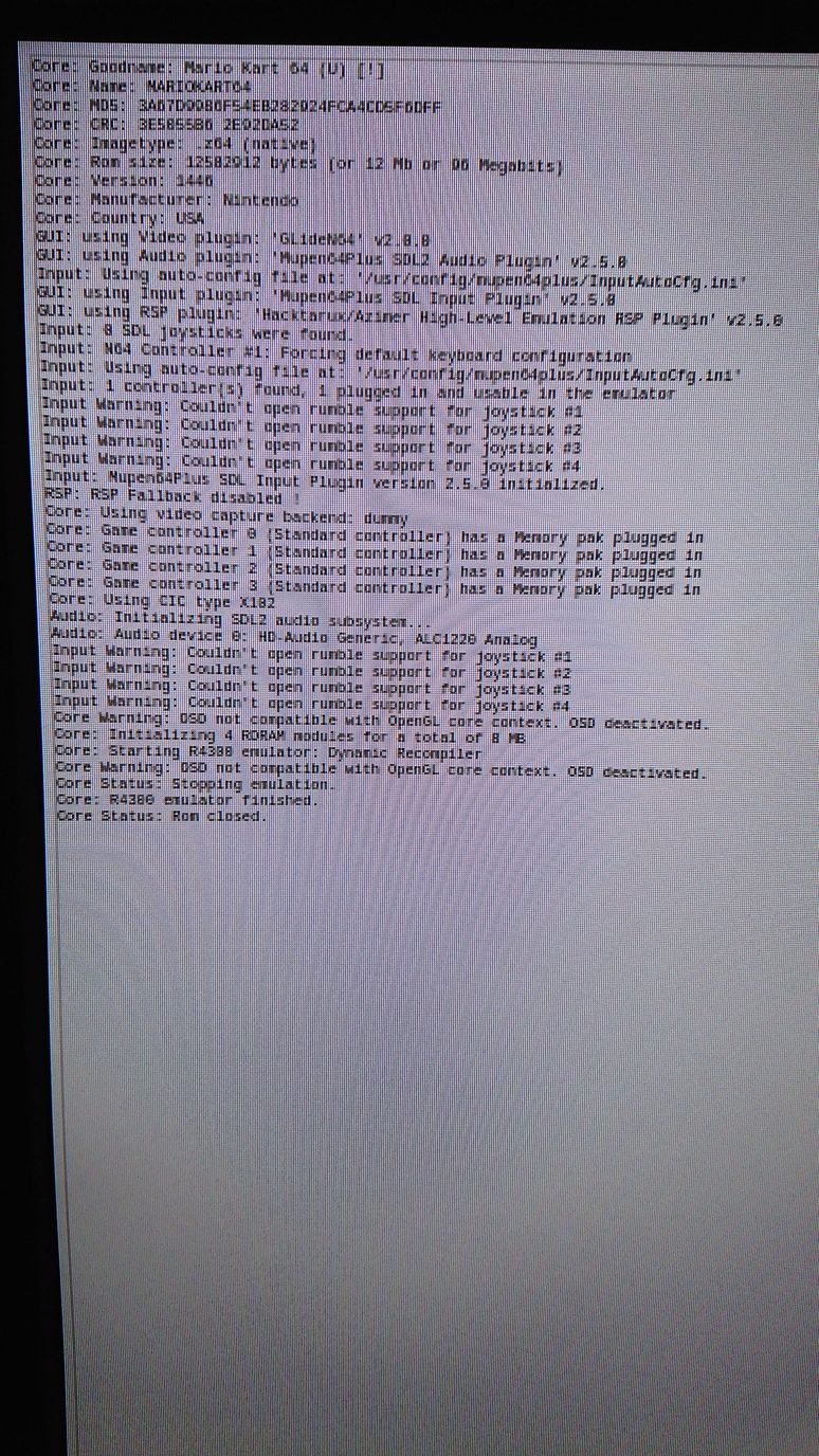 Kodi, Emulation Station and RA have working audio, asound.conf was correctly set automaticaly, but m64p is still using wrong audio out (analog instead of hdmi1) as you can see in my screenshot and errors in m64p.log
