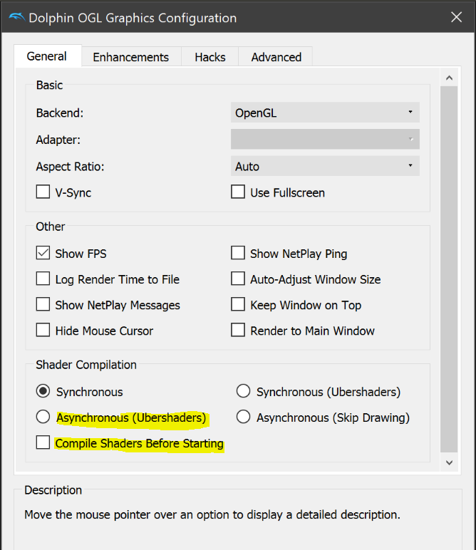 If you can deal with some pre generation time to avoid stuttering enable this & set the backend to Vulkan if possible. Then Dolphin compiles the shaders before the games starts if needed. Vulkan gets you a nice status bar while OpenGL showed a black screen in the past. Just get a coffee or a beer or whatever and let it do it's job, once it finished the game starts.