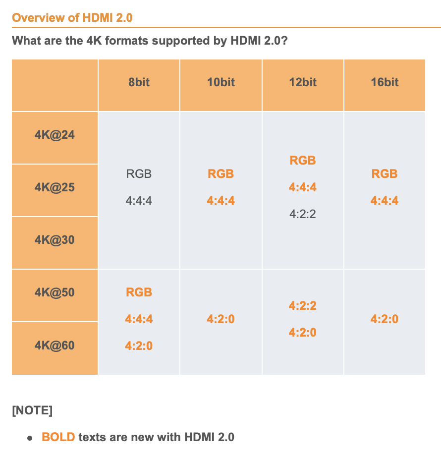 If so then 4:2:0 is the only format that will support 2160p50/60 with >8-bit for HDR - unless you are in the realms of HDMI 2.1 (or was >8 bit RGB/4:4:4 added in HDMI 2.0b for 2160p50 and above)?