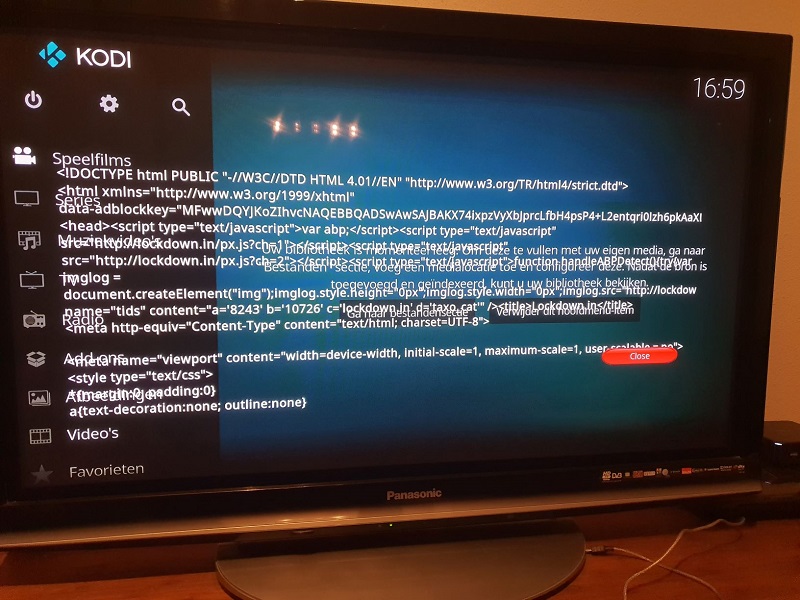 After booting in Kodi script block appears in my screen which I am able to click away with a Close button. The script opens with <!DOCType html> (see attachement)