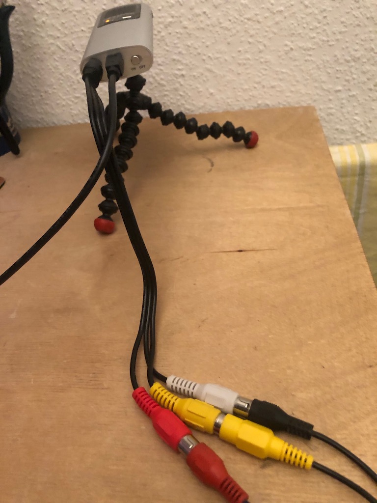 I connect the beamer with the analog "out" of the rasp and the "in" of the beamer. I use two "headphone jack" to chinch adapter to check if the signal is switched between the audio and the video composite.