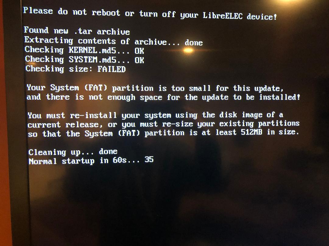 I've just ran into a problem trying to update one of my NUC's from 8.25 to 9.01 (Kodi 17.6 to 18.1), got this screen which is really confusing since it's got a 32 GB drive. Anyone have any ideas how exactly I go about fixing this please?