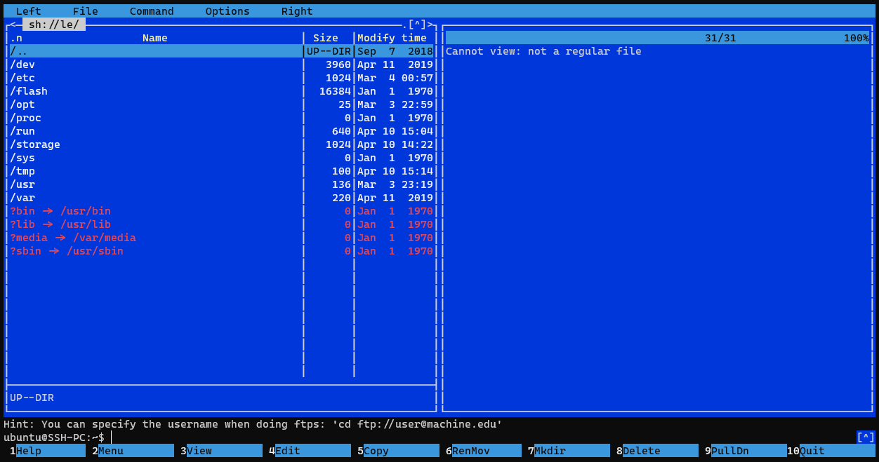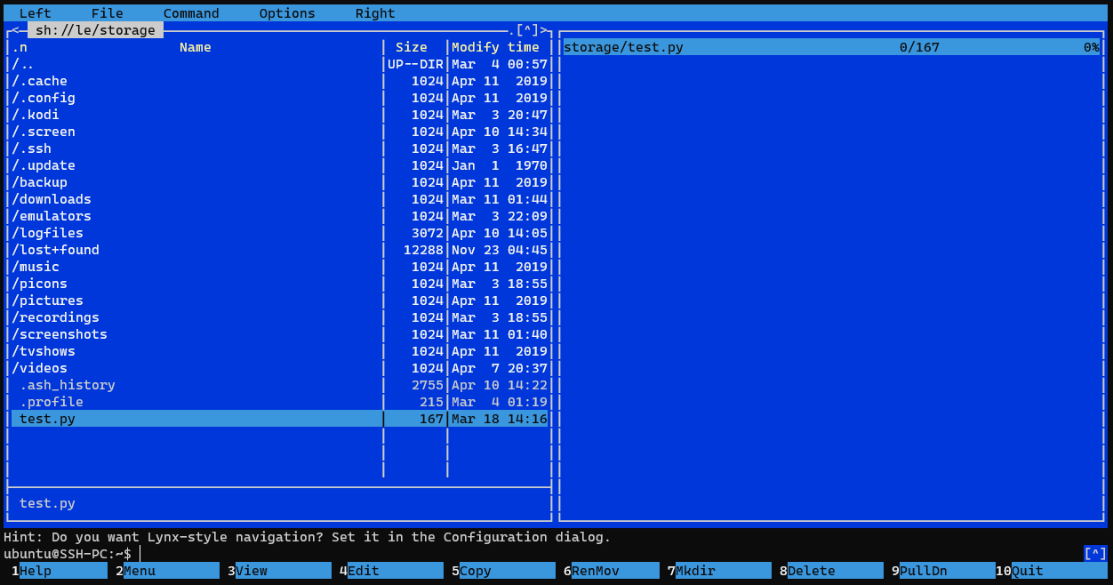 I'm able to copy files from/to LibreELEC with scp. But when I try to use Midnight Commander and its Shell link feature I can't copy or view(F3) files. They are copied as empty files (size = 0).