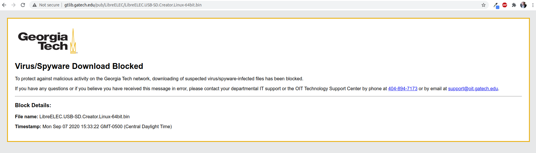 The download page for 64-bit Linux (http://www.gtlib.gatech.edu/pub/LibreELEC/…Linux-64bit.bin) is throwing an error page reading "Virus/Spyware Download Blocked: To protect against malicious activity on the Georgia Tech network, downloading of suspected virus/spyware-infected files has been blocked."