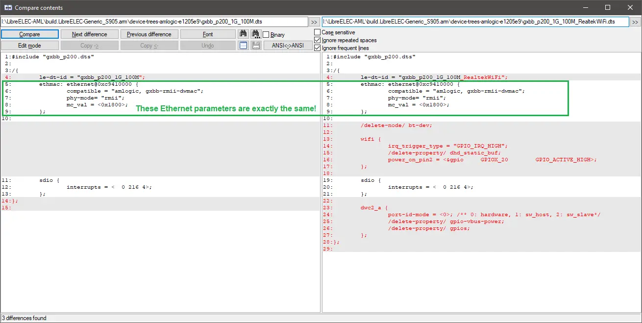 Meanwhile, I compared the p201 and gxbb_p200_1G_100M dtbs, and their Ethernet parameters are exactly the same, so there can be no significant difference between them. Therefore, I don't understand why your Ethernet didn't work with the gxbb_p200_1G_100M_RealtekWiFi.dtb, unless it's because it comes from a different build (e.g. a different LE build or CE).