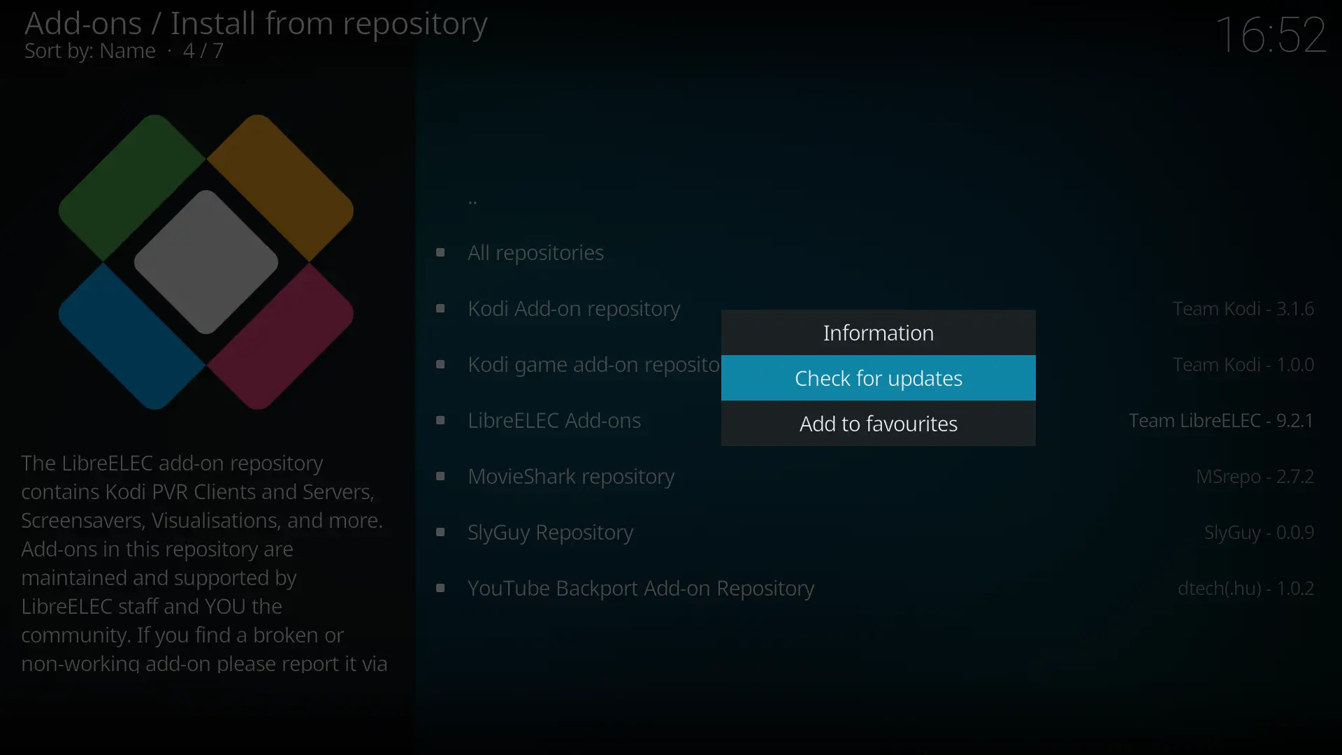 Code2019-04-11 16:29:01.220 T:2891973376 ERROR: CCurlFile::FillBuffer - Failed: Couldn't resolve host name(6) 2019-04-11 16:29:01.221 T:2891973376 ERROR: CCurlFile::Open failed with code 0 for https://libreelec.dtech.hu/packages/9.2.1/S8X2/arm/addons.xml.gz.sha256: 2019-04-11 16:29:01.221 T:2891973376 ERROR: Open - failed to open source <https://libreelec.dtech.hu/packages/9.2.1/S8X2/arm/addons.xml.gz.sha256> 2019-04-11 16:29:01.221 T:2883580672 ERROR: CCurlFile::FillBuffer - Failed: Couldn't resolve host name(6) 2019-04-11 16:29:01.221 T:2891973376 ERROR: CRepository: failed read 'https://libreelec.dtech.hu/packages/9.2.1/S8X2/arm/addons.xml.gz.sha256'You can manually trigger the repo update: Settings -> Add-ons -> Install from repository and select the LibreELEC Add-ons repository, and after pressing the menu button, select the Check for updates option.