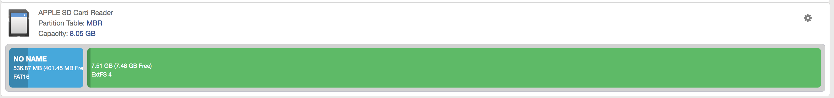The partition on the sd card are Fat16(536MB) and ExtFS4(7.51GB)