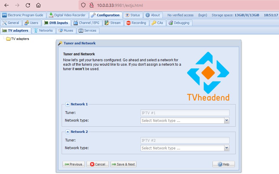 After installing the TVHeadend Server 4.2 add-on, on the Configuration web page, the DVB input tab shows no TV adapter.