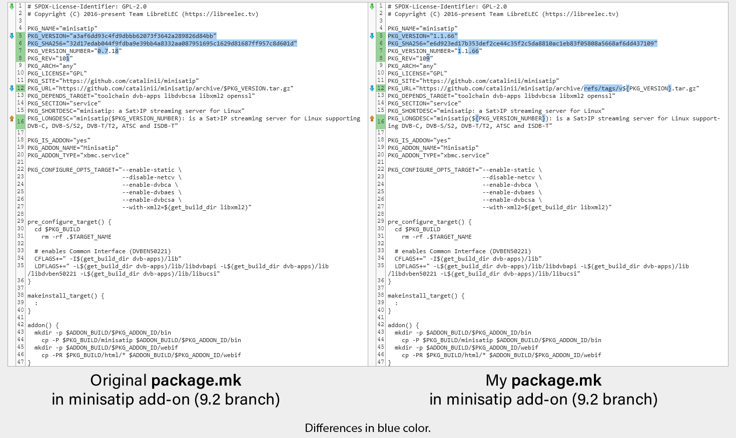 I've attached a comparison of the original package.mk and my modified package.mk.
