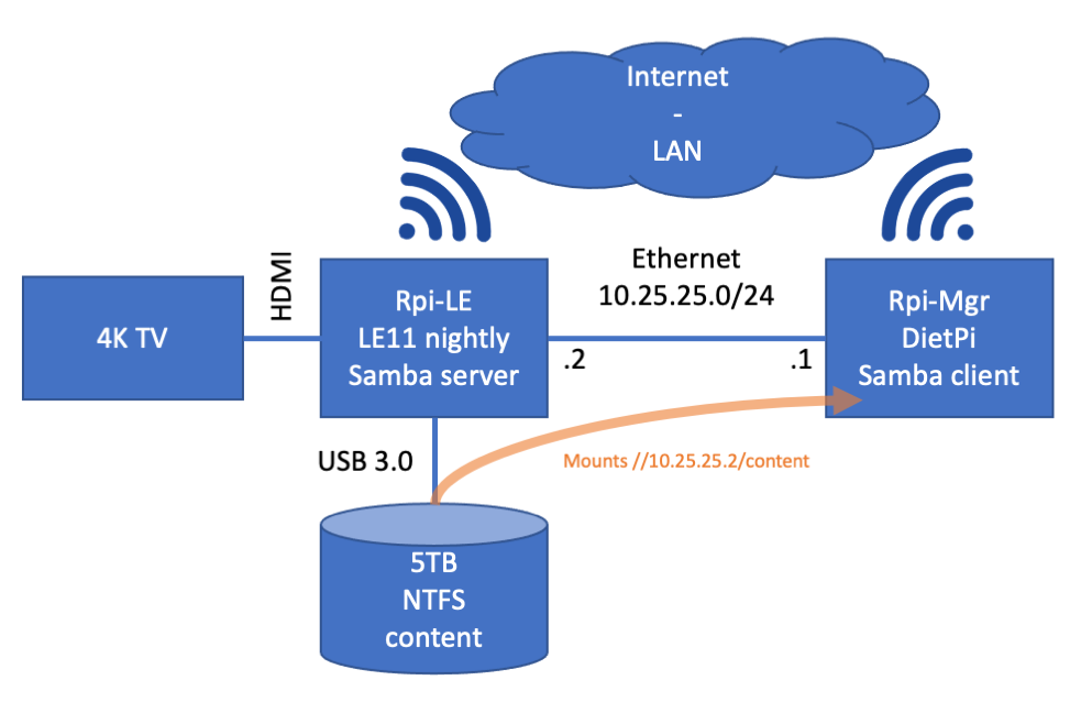 There is another Raspberry Pi (RPi-Mgr), running DietPi, connected to the first using the private Ethernet link, mounting the above shared drive through this link, vers=3.1.1 (tried going down to 2.0 with the same results). This Pi manages the content on the USB hard drive.