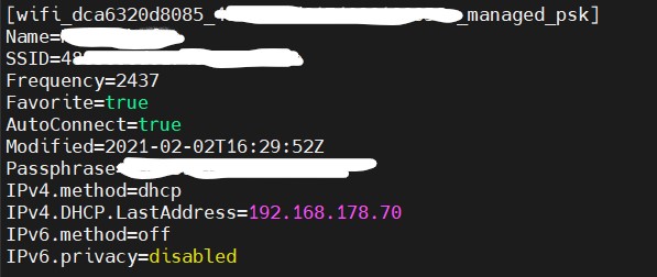 - Navigate to ~/.cache/connman/wifi_<string that is individual for your installation>/ and open the settings file