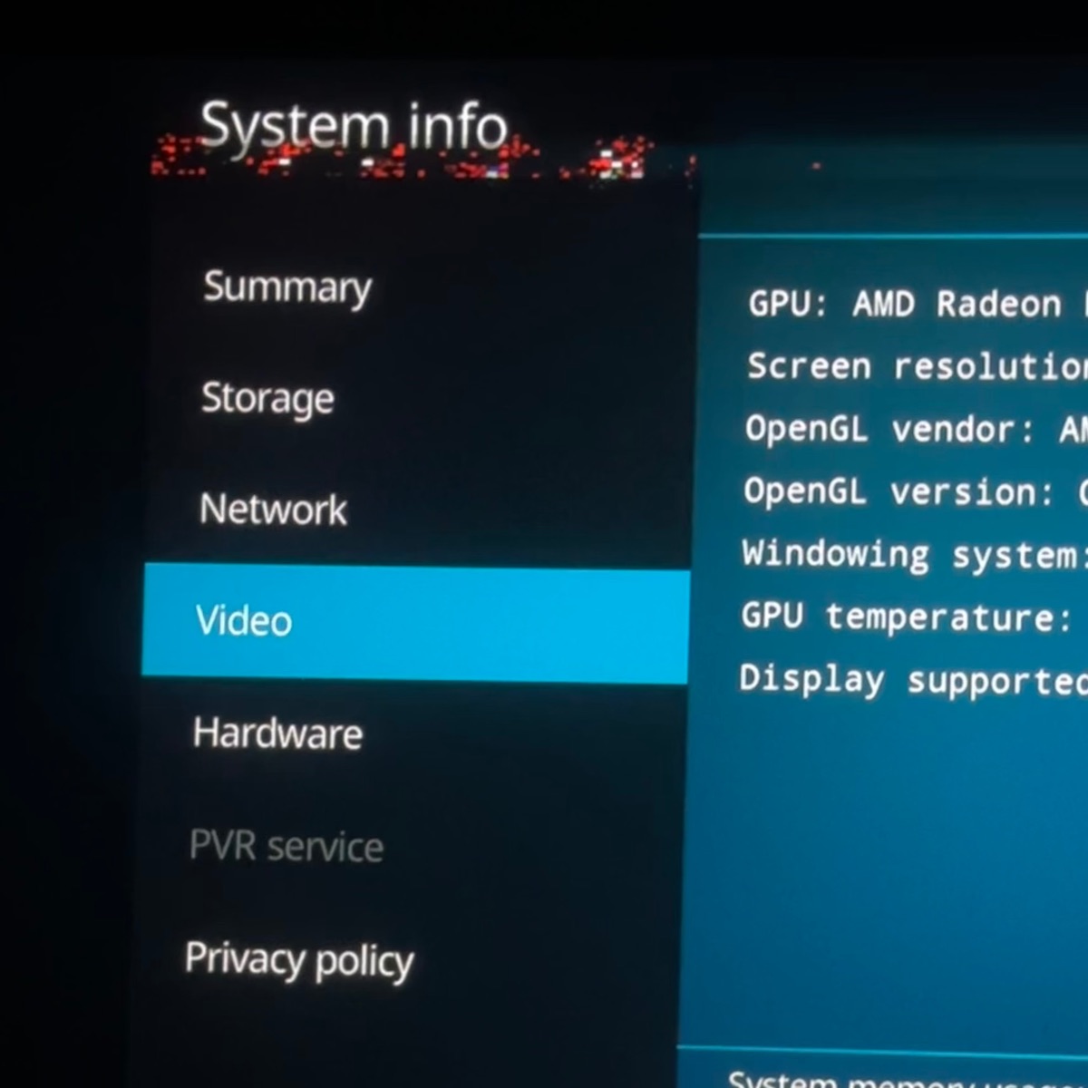 I have noticed that changing resoluton sometimes helps, but the issue always comes back within several seconds: For me there are large flickering black triangles usually across the top of the display whenever the GUI or overlays like Player controls are rendering, these are more visible when pressing buttons on the remote.