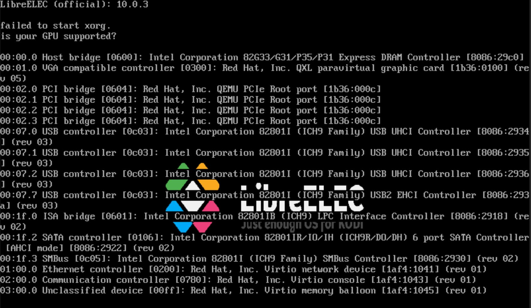 That's strange because I get this message after installing LibreELEC using VNC. When I assign my GPU the screen just stays black.