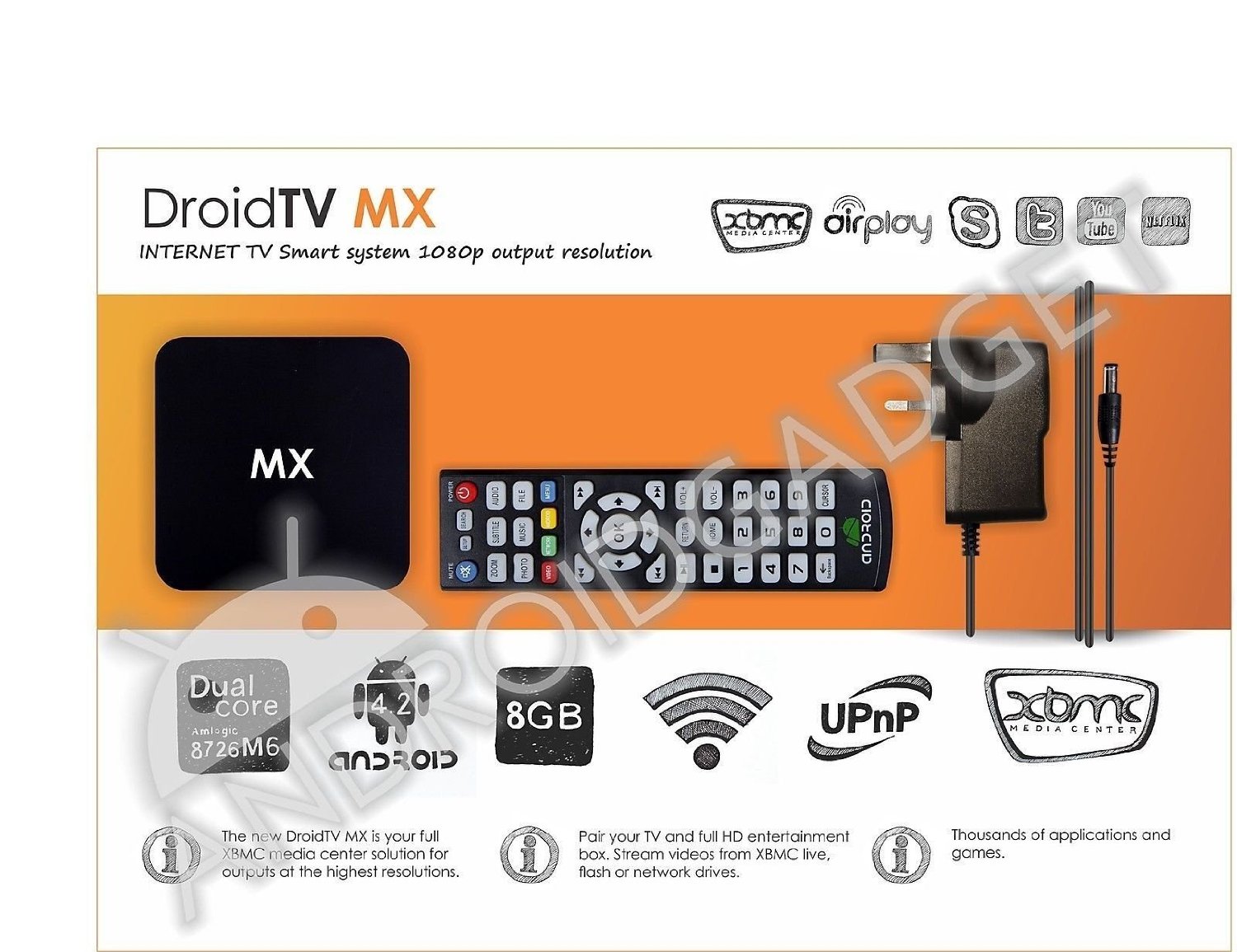It is tested on DroidTV MX and G-Box Midnight MX2. Both have the same IR remote (see the pictures). If your device has different remote try connecting USB keyboard.