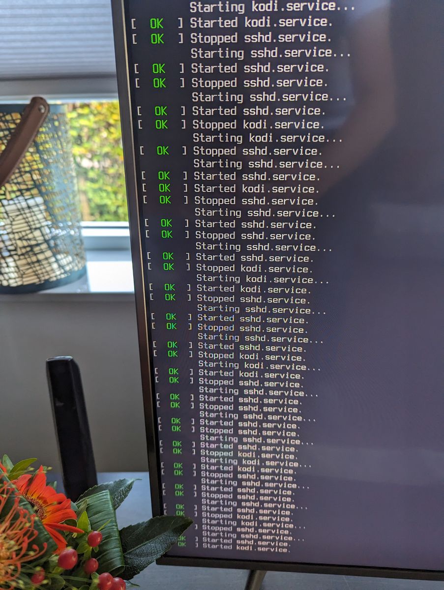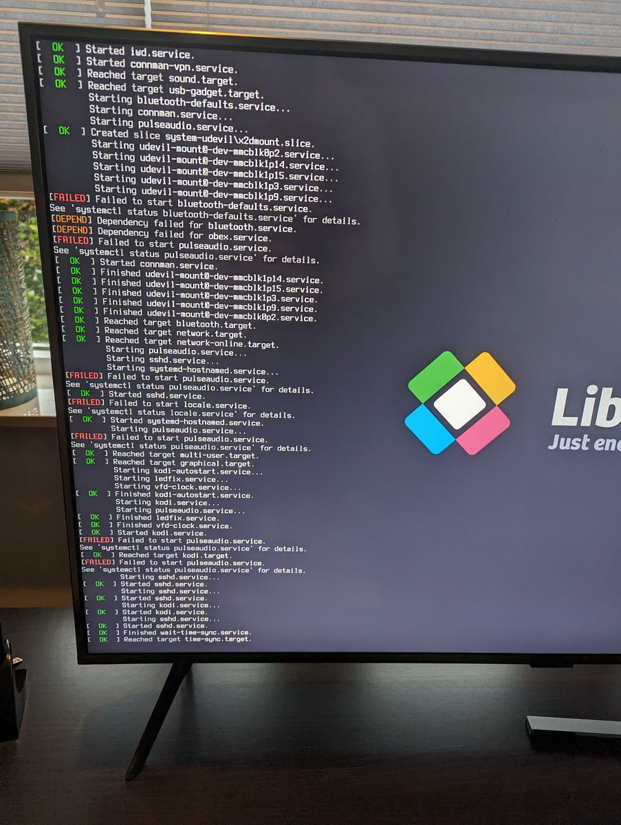 I'm trying to use LibreELEC on my Minix Neo U9-H. I've flashed LibreELEC-AMLGLX.arm-11.0.3-box.img.gz onto a MicroSD card, put it into the Minix and held down the power button. It gets stuck on the boot screen with the LibreELEC logo. I've also tried removing the quiet parameter from the boot arguments to see what's going on. It looks like it keeps starting kodi.service, then stopping it again. The process goes like this: