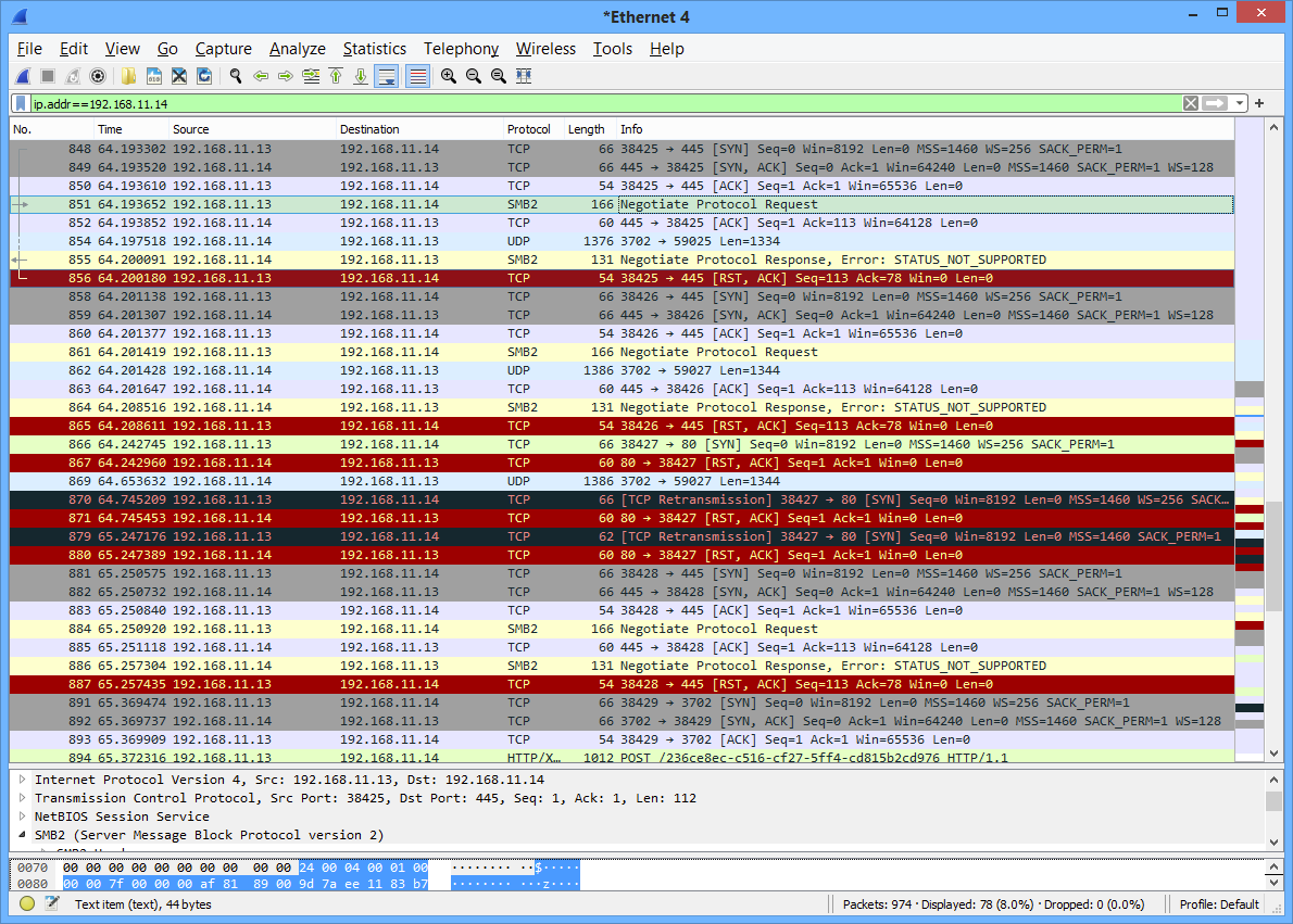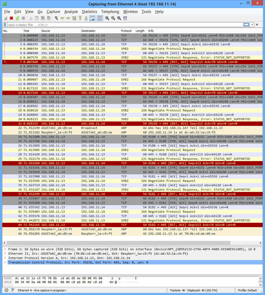 Here's a WireShark capture on the PC; .13 is the PC, .14 the LE Pi:
