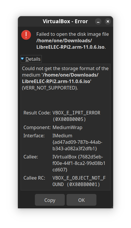 I have the latest rpi2/3 img.gz file. I've converted it to an iso using iat --iso -i [LEfilename].img.gz -o [LEfilename].iso in the terminal, so that VB will see/load it, but that craps out with a (VERR_NOT_SUPPORTED) error, so I'm hitting a roadblock at Step 1b, and it's not making me hopeful for "my" "plan".