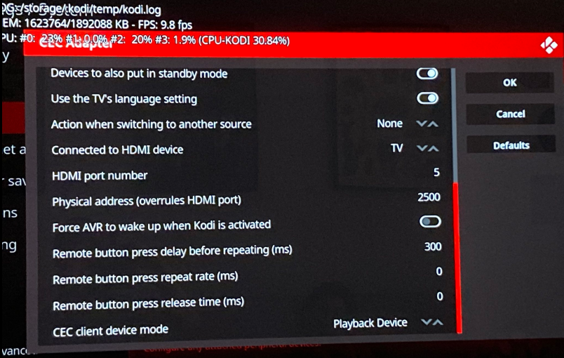 These are my CEC adapter settings after doing all the operations below. Note that it switch to TV as connected HDMI device instead of AVR as I initially set it up with no way to make the correct setting "stick".