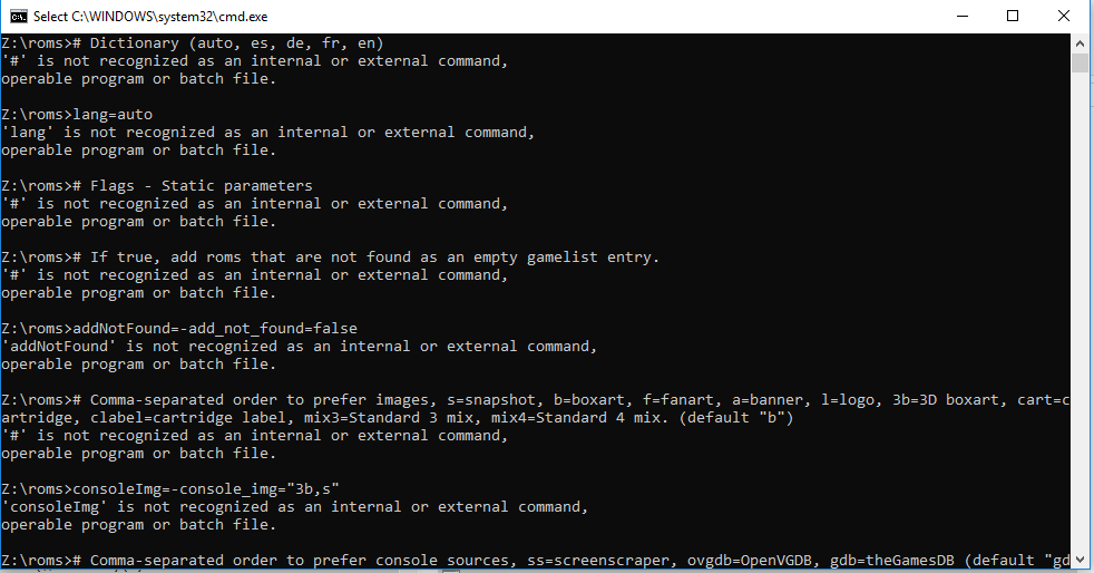 Thank you very much for this. It is very much appreciated. However, I have the drive mounted and the batch file in the roms folder. When, I try to run the script it runs the script very quickly and closes out. I am able to stop it before it closes if I click the mouse really fast to catch it. I was able to get an attached screenshot of what it is saying. It says "It says it is not recognized as an internal or external command" for every line. I even tried to run this on a separate computer (windows 10 also) and got the same result. I tried turning off antivirus, firewalls, etc...still the same. I even googled this problem, followed this article A command is not recognized as an internal or external command, and still got the same result.