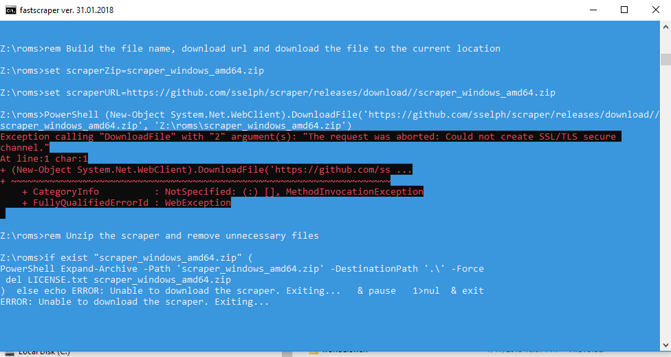try to run script as administrator..if it doesn t work try to create a folder on your windows 10 and run script in there so it downloads the scraper and then move scraper to mapped roms folder..