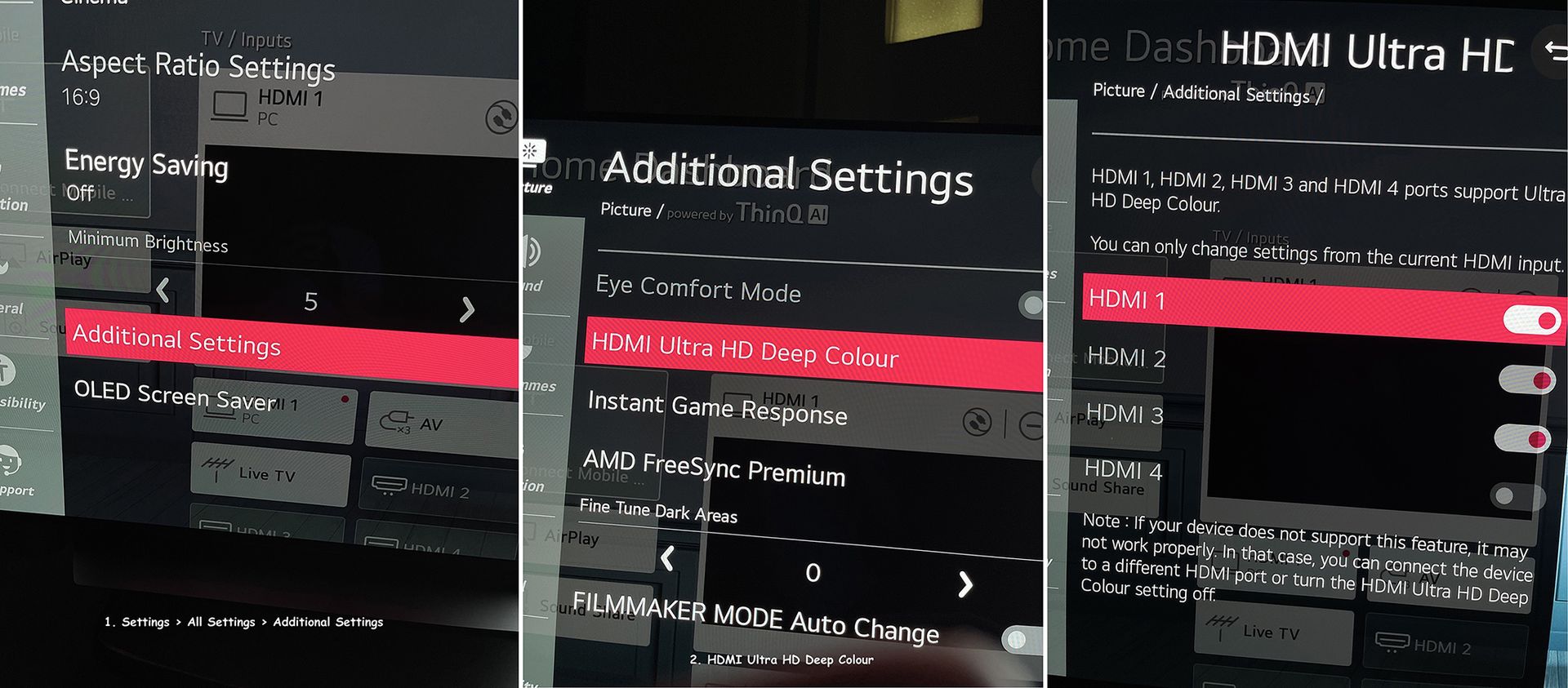 • You probably need to enable HDR modes for specific HDMI sockets. Something like "Enhanced Mode" or "Deep Colour Mode" or such (there is no standard term).