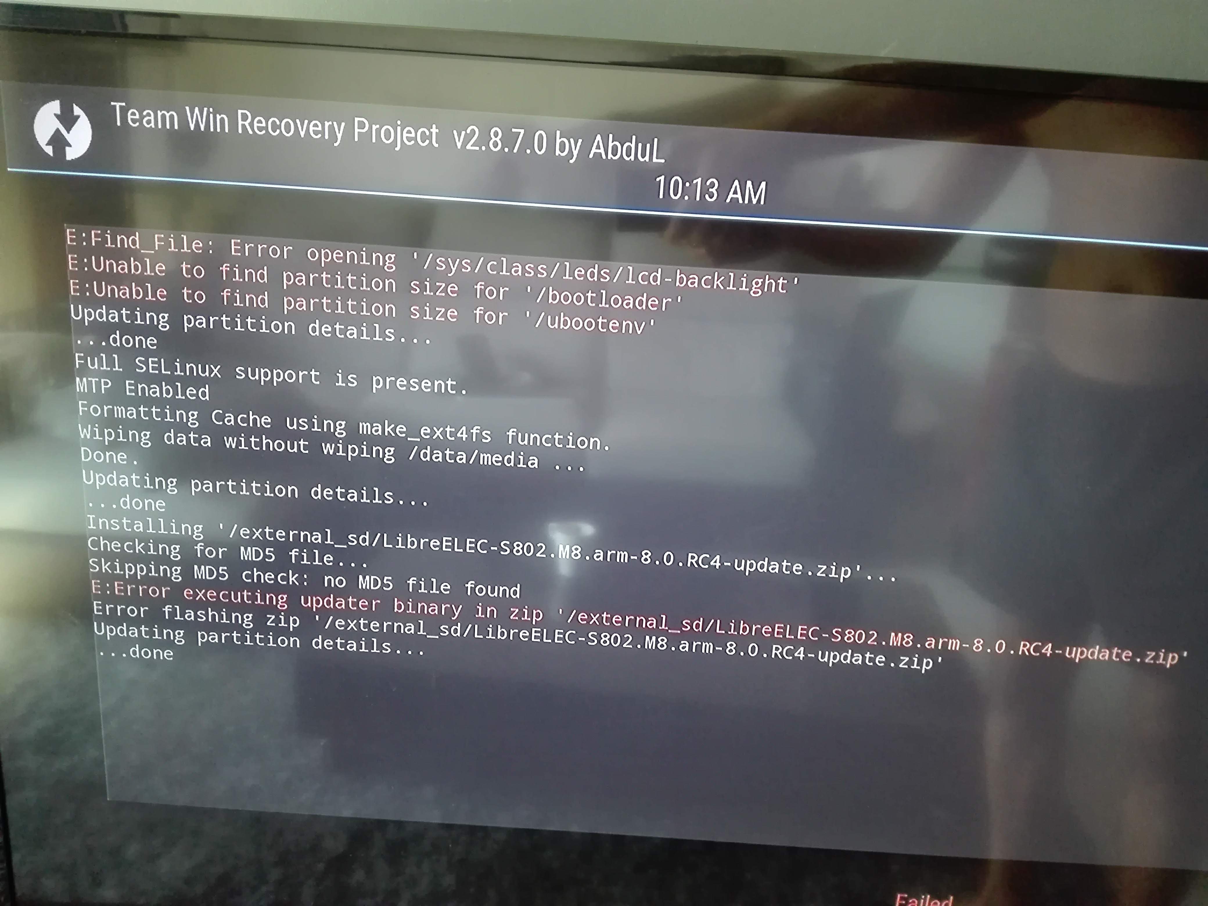 With version 8 LibreELEC-S802.M8.arm-8.0.RC4 I cant install (attach error)