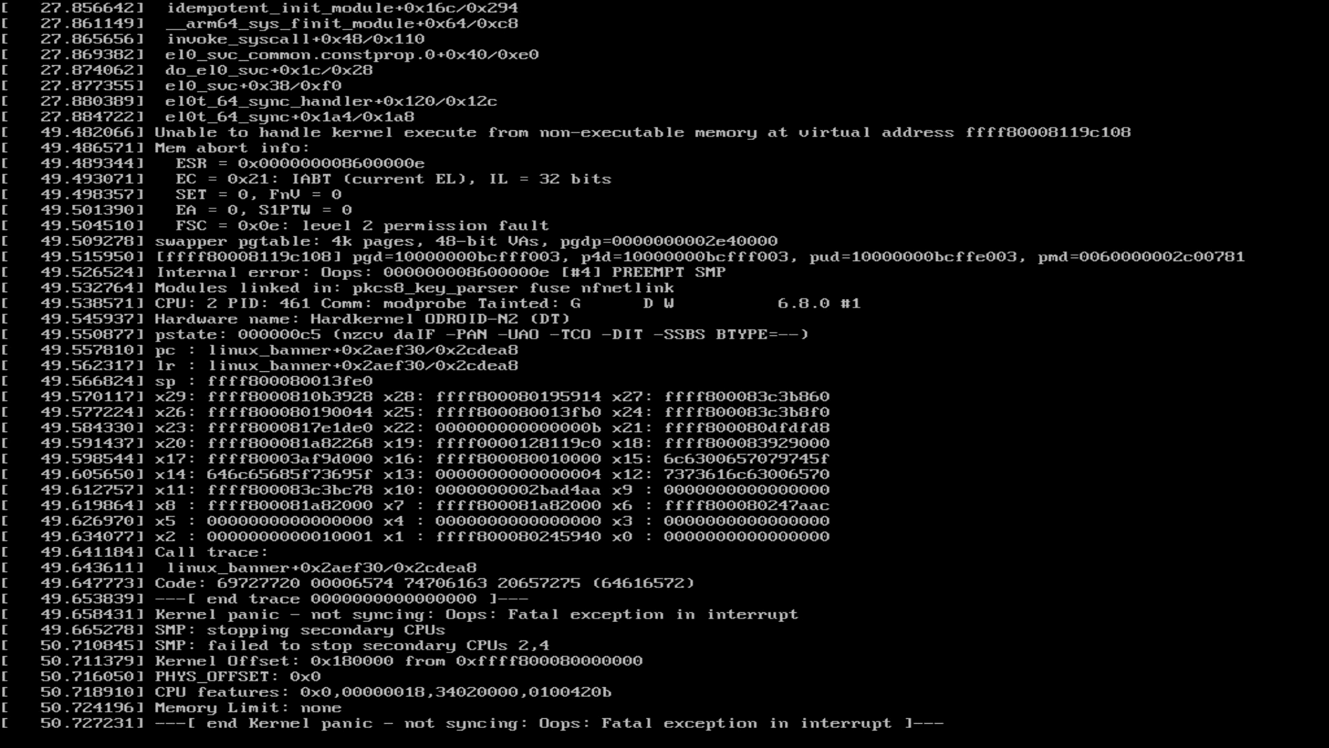 Hello folks. I have an old N2 lying around and wanted to give LibreElec a try, but I can't seem to get it to boot. My board is from lot 1905 (2019) if that makes a difference. The first boot appears to be OK with the partition resizing, but then after it reboots (and on subsequent boots) I see a kernel panic and some debug prints that I don't understand. Here's a screenshot captured through an HDMI capture card. I can't seem to get anything on the UART.