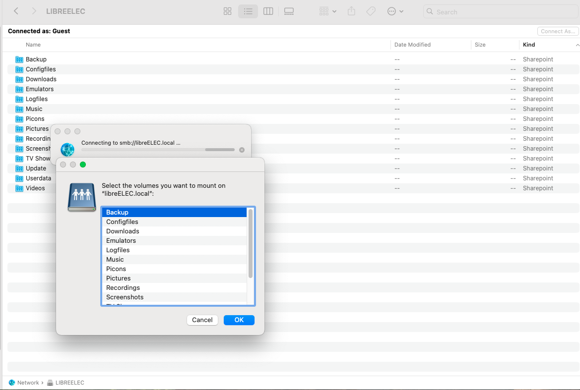 2. now use workaround / in finder/ GO / connect to server / (insert adress) / smb://libreELEC.local (it should no longer ask for password but open dialogue window asking you which folder you wanna connect to.