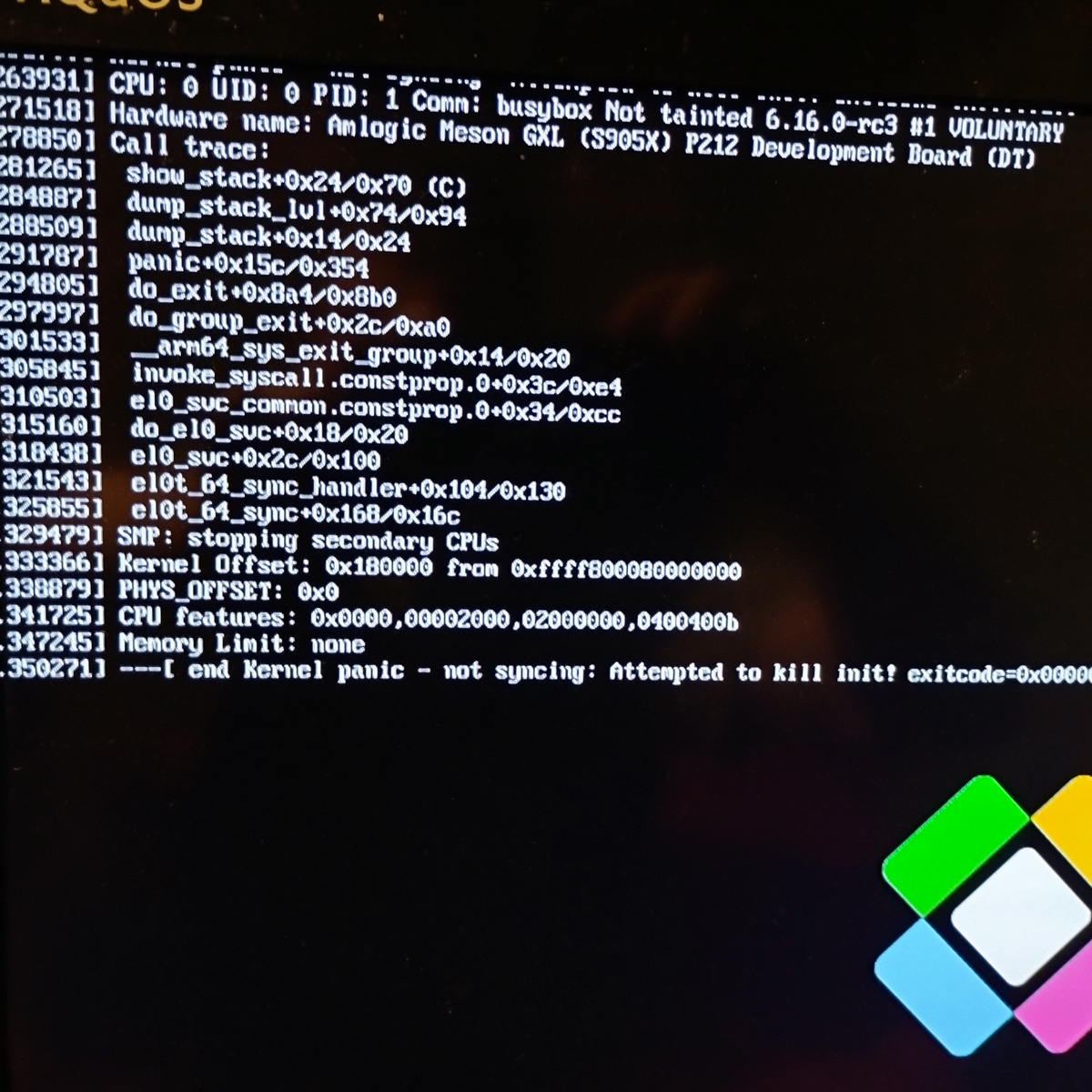 August 10, 2025 at 10:14 PM #1 Create image periodically(git), last working "LibreELEC-AMLGX.aarch64-13.0-devel-20250727023644-aac9548.tar", all after get kernel panic. I tried Image "LibreELEC-AMLGX.aarch64-13.0-nightly-20250807-4dfef48-box" from 13.0/Amlogic/ not boot.