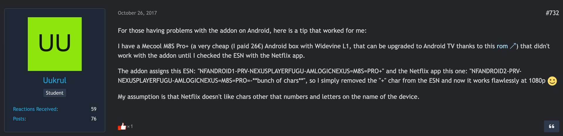 And, looking on the developer's Git page, there seemed to be a manual fix for this esn issue (https://github.com/CastagnaIT/plu…bdc4d41c16d0233), so I manually updated the file: /storage/.kodi/addons/plugin.video.netflix/resources/lib/kodi/uixmldialog_esnwidevine.py - sadly to no avail: