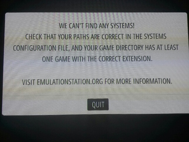 That error screens means you have no roms in rom folders, so there is no system to show. If you copy some roms inside roms/whatever that system will show in emulationstation...