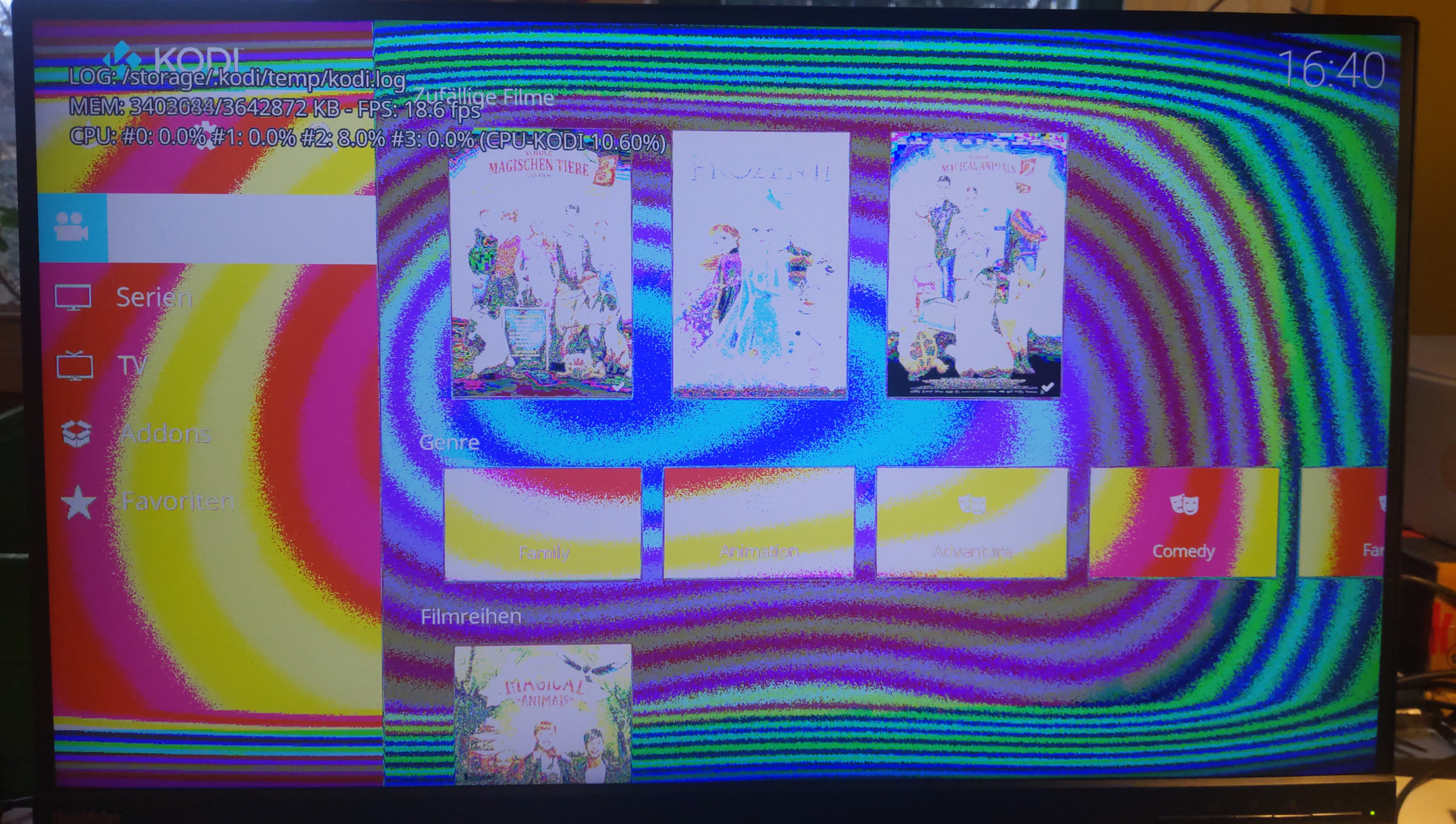 • The "normal" problem with projectors is limited-range vs full-range colourspace, but the "flashed in rainbow-like colour" description doesn't fit the normal comment of colours looking a bit washed out. So assuming you have removed and reseated cables, to triage anything you need to provide some pictures and tell us what the projector indicates is being sent on the HDMI connection, e.g. the resolution, bi-depth, colourspace, etc. - and put Kodi into debug mode with a current LE13 nightly image and run "pastekodi" then share the log URL. The log probably won't tell us anything useful (same as the mode output you shared) but you never know.