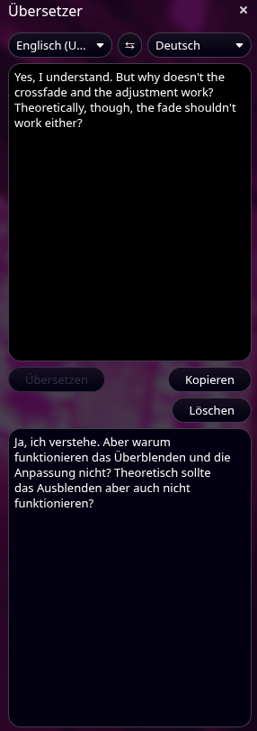 So then I would say you should change your translator. As you can clearly see in the picture, I wrote, why does the fade work but adjusting the volume doesn't? Yes, I understand. If things get uncomfortable, a reason is quickly sought. Top.