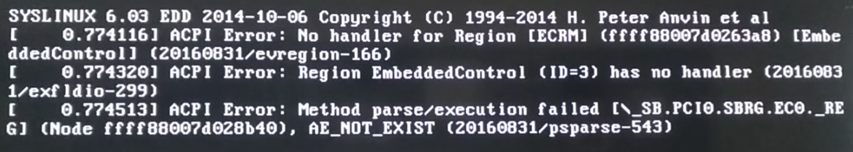 [ 0.7741161 ACPI Error: No handler for Region [ECRM] (ffff88007d0263a8) [EmbeddedControl] (20160831/evregion-166)