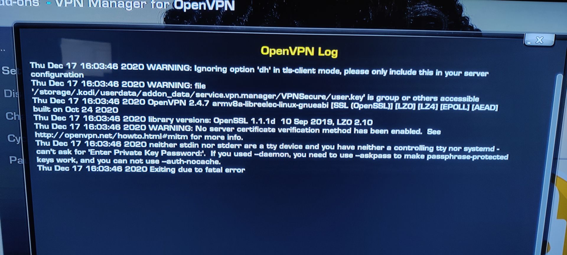 Mon Dec 14 19:22:02 2020 WARNING: file '/storage/.kodi/addons/service.vpn.manager/HideMe/ta.key' is group or others accessible
