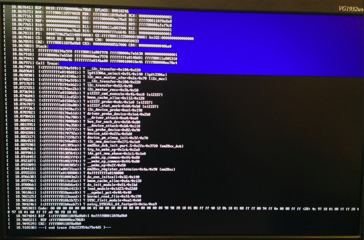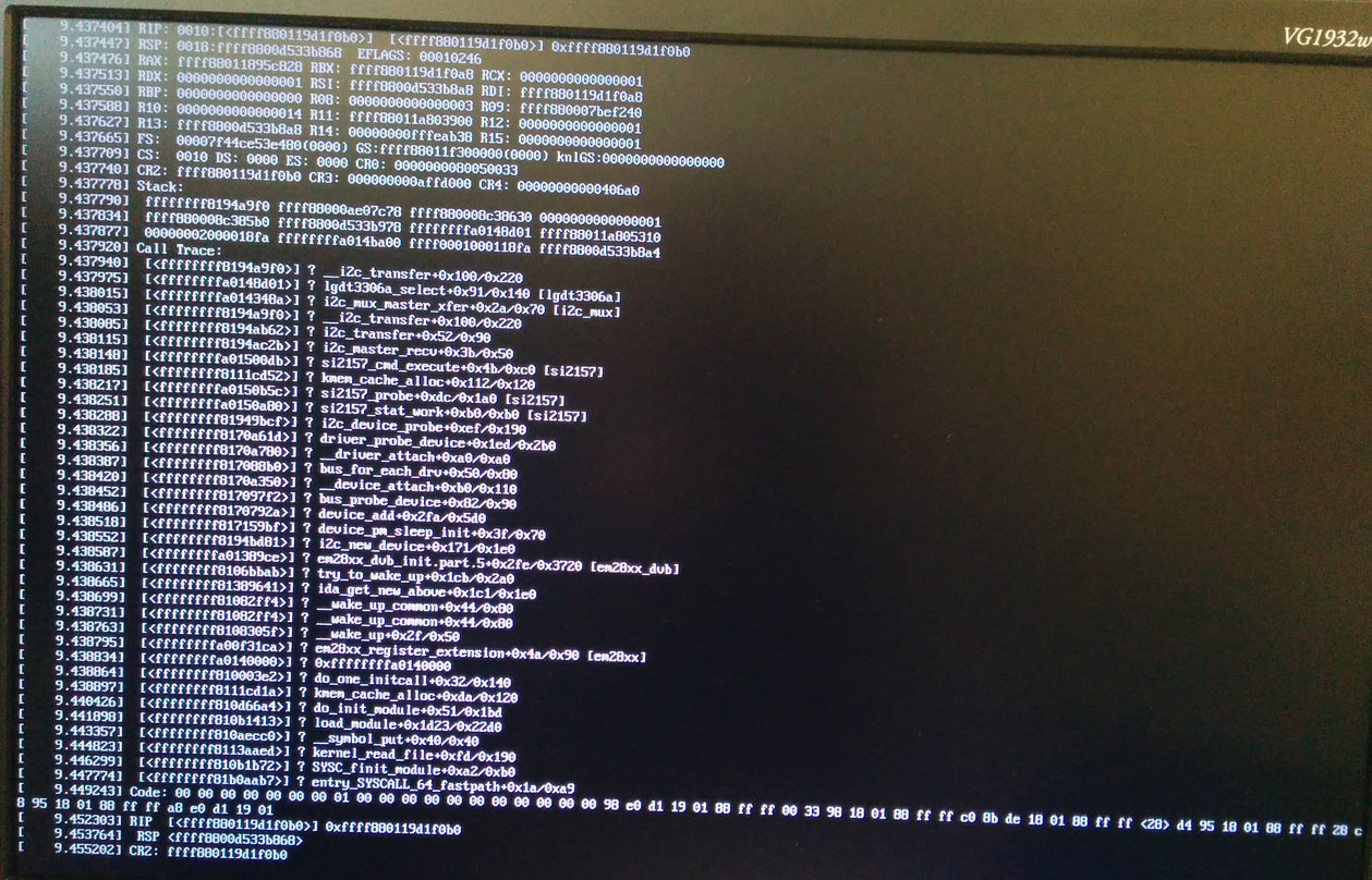 [ 9.051483] Modules linked in: si2157(O) lgdt3306a(O) i2c_mux em28xx_dvb(O+) dvb_core(O) snd_hda_codec_hdmi snd_hda_codec_realtek snd_hda_codec_generic em28xx(O) v4l2_common(O) tveeprom(O) videodev(O) snd_hda_intel snd_hda_codec intel_powerclamp snd_hda_core intel_rapl snd_hwdep nuvoton_cir(O) rc_core(O)
