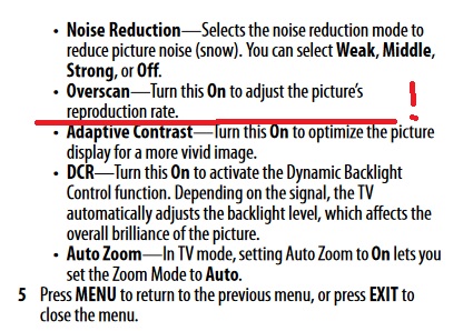 The set does not have an accessible overscan control (greyed out in the setup menu). The only setting is a wide/cinema/zoom which results in the same or worse - in normal it makes the picture take up the center of the screen and still be clipped as displayed in the image attached.
