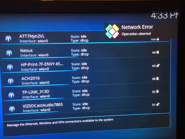 So a few weeks ago I updated from an older version of libreelec to 8.0.1. In the older version my wifi worked well. Some things happened and I had to leave break my lease before I ever got a chance to mess with the new update on my old wifi. Now I am trying to hook up to the wifi where I am staying currently and the system shows the wifi and every time that I type in the password I get "Network Error" "Operation Aborted". I have formatted my sd card and downloaded all of the OS again. I have turned off the wireless setting to reboot the hardware and turn it back on. I have triple checked the password and that the human error is not an issue. If you can help I would greatly appreciate it. I don't have the option to plug into the Ethernet cable.