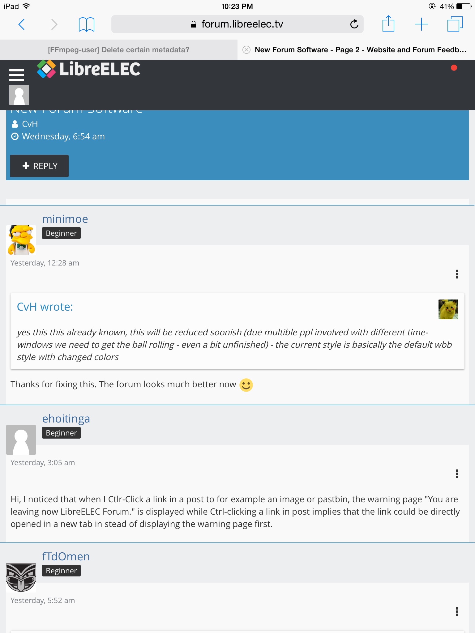 • Hi, I noticed that when I Ctlr-Click a link in a post to for example an image or pastbin, the warning page "You are leaving now LibreELEC Forum." is displayed while Ctrl-clicking a link in post implies that the link could be directly opened in a new tab in stead of displaying the warning page first.