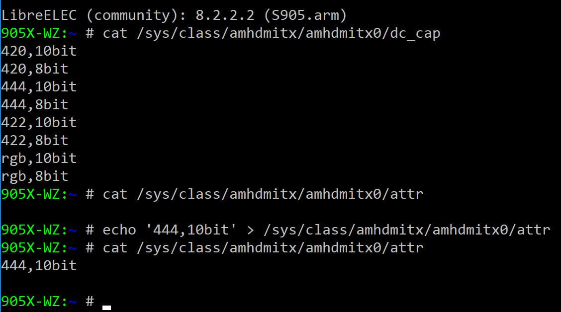 echo '444,10bit' > /sys/class/amhdmitx/amhdmitx0/attr
