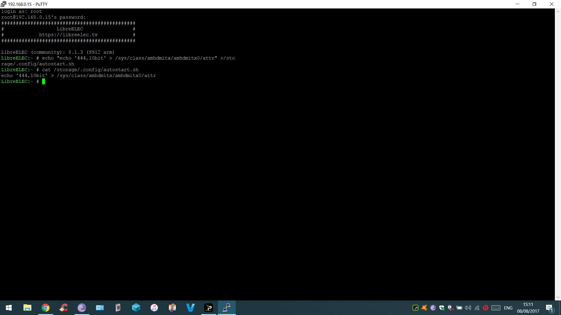 - On a new boot before any other playback has been performed, run the following: echo '444,10bit' > /sys/class/amhdmitx/amhdmitx0/attr