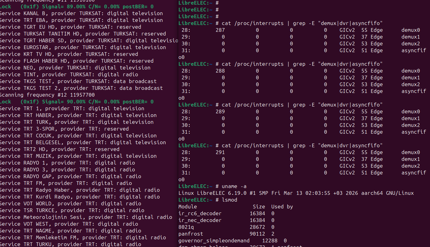 Get the device information with cat /sys/kernel/debug/pinctrl/*/pinmux-functions and edit the mainline dts accordingly. You may need to shut down some nodes or redirect them to the correct pin due to pin conflict. I gave the driver as an addon. Copy the AVL6862 folder under LibreELEC.tv/packages/linux-driver-addons/dvb/ and add PROJECT=Amlogic DEVICE=AMLGX ARCH=aarch64 ./scripts/create_addon AVL6862 compile. Of course, if the dts is not correct, the driver probe will not occur. Maybe you can take it one step further.good luck