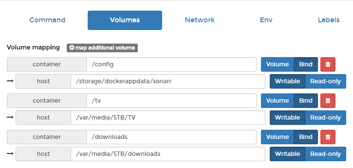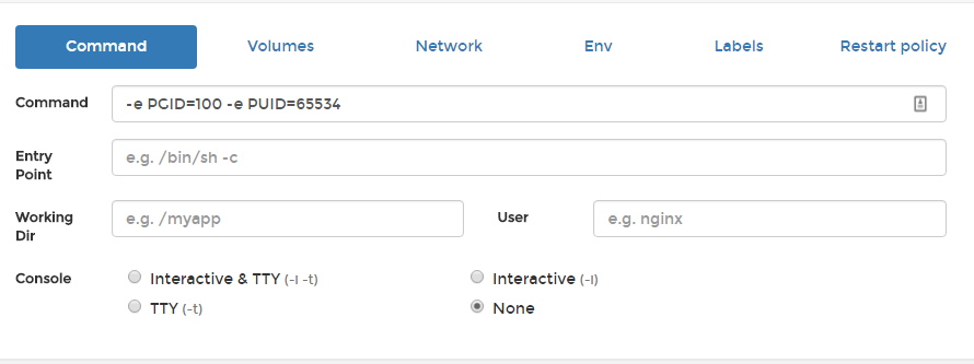 The pgid and puid should be entered under the env tab (environment variables), not under command. The command is what is supposed to run after the container is created. You want to leave that as default otherwise container will likely attempt to execute the command and once it fails, it will stop.