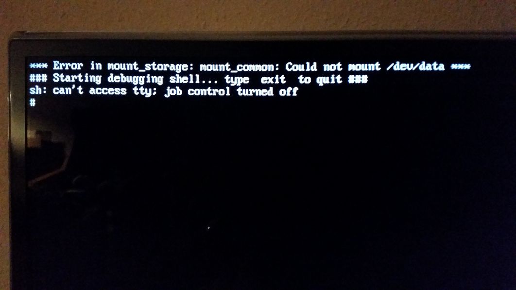 I let the box alone for a while (about 15 or 20 minutes). As i returned I got a message on the screen stating "unable to mount /dev/data"