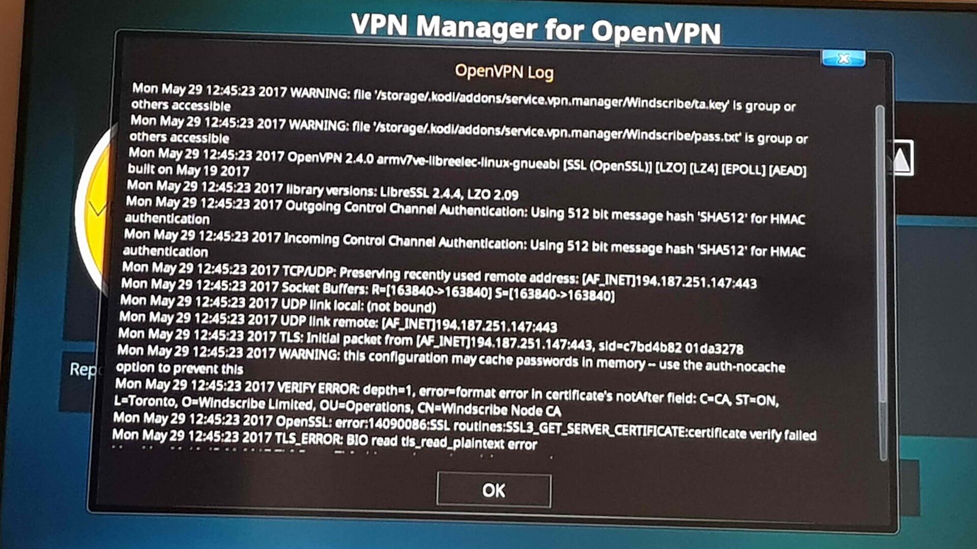 I'm not sure how to access a copy of the log file, but quickly scanning it for errors it says VERIFY ERROR: depth=1, error=formar error in certificate'snotAfter field: C=CA, ST=ON, L=Toronto, O=Windscribe Limited etc etc